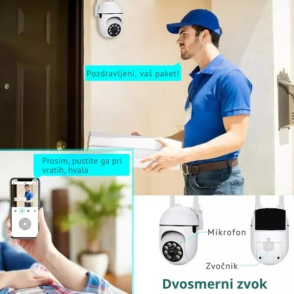 Zunanja varnostna kamera ima vgrajen odzivni mikrofon, s pomočjo katerega lahko poslušate in govorite prek naše aplikacije. Dvosmerni avdio omogoča komunikacijo z vašimi zaželenimi gosti, s pomočjo alarma za zaznavanje gibanja pa se lahko hitro znebite neželenih gostov ali živali.
